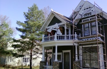 The style of architectural decoration known as 'gingerbread' did not become widely established until the steam-powered scroll saw and lathe became widely available in the middle 1800's. Then the parts could be easily mass produced. There are a variety of elements making up “gingerbread trim” including swags, brackets and teardrop pieces. Porches and balconies are decorated with turned posts and curving corner brackets. Often a solitary window and gracefully carved ridge boards decorate the roof peaks.